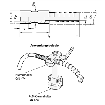Mit Edelstahl-Schlauchadaptern GN 480.7 werden z.B. Blasdüsen oder Kühlschmierdüsen und deren Zuleitungen zusammen mit Klemmhaltern befestigt und in Position gehalten. Die Gewinde- und Tüllendurchmesser d2 / d3 sind auf die gängigsten Verschraubungs- und Schlauchdurchmesser abgestimmt. Schlauchleitungen werden mit geeigneten Klemmen an der Schlauchtülle befestigt und gegen Abrutschen gesichert.