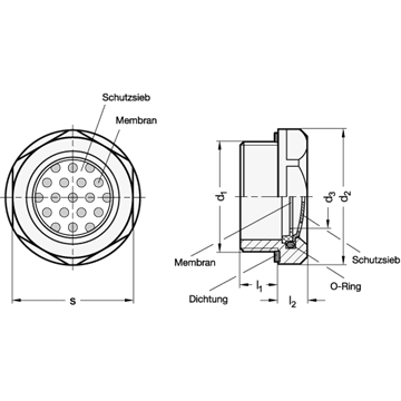 Edelstahl-Be- und Entlüftungsmembranen GN 7404 werden im Gehäuse- und Gerätebau eingesetzt. In einer Gehäusewand eingebaut, ermöglichen sie einen Druckausgleich zwischen Gehäuseinnenraum und der Umgebung. Mögliche, vom gasförmigen Medium mitgeführte Schmutz- und Staubpartikel, aber auch Öl- und Wassertropfen werden zurückgehalten. Dies schützt den Gehäuseinnenraum vor Verschmutzung und Nässe und hindert z.B. Öltröpfchen am Austritt in die Umgebung. Ein vollständiges Bedecken der Membran mit Öl oder Wasser sowie ein Überschreiten des Differenzdrucks / Luftdurchlassvolumen sollte zum Schutz der Membranen vermieden werden. Der Einbau in geschützter Position seitlich / vertikal ist zu bevorzugen. Der Außen-Ø der Gehäuse mit dem zurückgesetzten Sechskant ist auf Einschraublöcher für Rohrverschraubungen DIN 3852 abgestimmt. Die Dichtung ist in einem planseitigen Einstich eingebettet. Dadurch ist sie gegen Verlust geschützt und kann beim Anziehen nicht herausgequetscht werden.