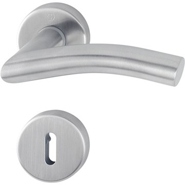 Rosetten-Garnitur mit Schlüsselrosetten · geprüft nach DIN EN 1906: 37-0140A (Gebrauchs-Kategorie Klasse 3), Objekt-Garnitur · Lagerung: Türgriffe lose, Rückholfedern rechts/links verwendbar , wartungsfreie Gleitlager · mit Schnellstift-Verbindung bei D/D mit HOPPE-Vollstift (Loch-/Lochteil), bei K/D mit HOPPE-FDW-Vollstift (Lochteil)· Unterkonstruktion: Kunststoff, Stütznocken · Befestigung: verdeckt, durchgehend, wechselseitig, MehrzweckschraubenACHTUNG: bei Wechselgarnituren bitte auf DIN rechts oder links achten! · Weitere technische Eigenschaften Drückerlänge: 124mm · Befestigungssystem: Schnellstift · Ergänzung: D/D · Drückertiefe: 59mm · Nockenabstand: 38mm · Farb-Nr.: F69 · Norm: DIN 1906